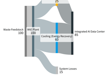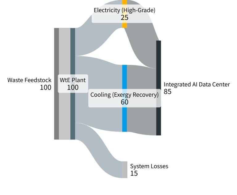 AI data-center expansion is increasingly constrained by the coupled availability of deliverable electricity and heat-rejection (cooling) capacity. We propose and evaluate an integrated Waste-to-Energy-AI Data Center configuration that treats cooling as a first-class energy service rather than an unavoidable electricity burden. The coupled system is modeled as an input-output 'black box' with transparent boundaries and a standalone benchmark in which mechanical chilling is powered by grid electricity. The central mechanism is energy-grade matching: low-grade WtE thermal output drives absorption cooling to deliver chilled service, thereby displacing baseline cooling electricity. We show that thermoeconomic superiority is governed by three first-order determinants, (i) cooling coverage of IT heat load, (ii) parasitic electricity for transport and auxiliaries, and (iii) distance-driven delivery decay, yielding a break-even corridor beyond which net benefits vanish. Comparative statics characterize sensitivity to IT utilization, feedstock quality (waste LHV and throughput), climate parameterization, and corridor distance. We translate these accounting gains into decision language through a computable prototype for Levelized Cost of Computing (LCOC) and an ESG valuation channel grounded in measurable mechanisms, without re-deriving full lifecycle inventories. The framework provides siting-ready feasibility conditions for WtE-AIDC coupling in urban AI corridors under grid stress.