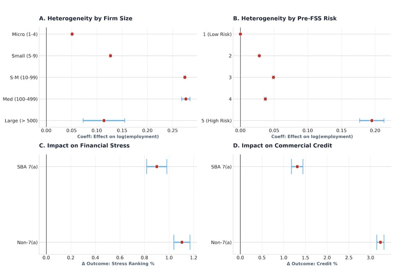 Using PSM-DID on a balanced panel from March to September 2020 and exploit variation in loan holding duration, I found PPP receipt raises employment by about 0.07 percent on average but improves failure-risk and delinquency-risk percentile rankings by roughly 1.2 and 3.2 points (significant but limited), respectively, with early loan recipiency strengthening all three margins. Heterogeneity analysis shows that small–medium firms and borrowers with intermediate pre-crisis risk experience the largest gains, while micro, very large, and highly stressed firms benefit less. Firms without prior 7(a) borrowing relationships realize particularly large credit-score gains. Overall, the evidence indicates that PPP functioned more as a balance-sheet and credit-risk backstop than as a powerful jobs program for the average treated firm.